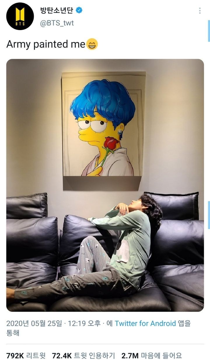 작년에 뷔가 팬들에게 본인을 심슨으로 그려주면 맘에 드는 그림은 직접 뽑아서 액자로 만들겠다고 한 적 있음