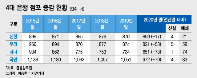 신한은행 관계자는 "타행들은 점포 통폐합을 사전에 많이 했지만 신한의 경우 고객 편의를 위해 미뤄온 게 사실"이라며 "기존 리테일(소매)에서 기업·디지털·자산관리 부문 활성화를 위한 체질 개선 차원"이라고 말했다.