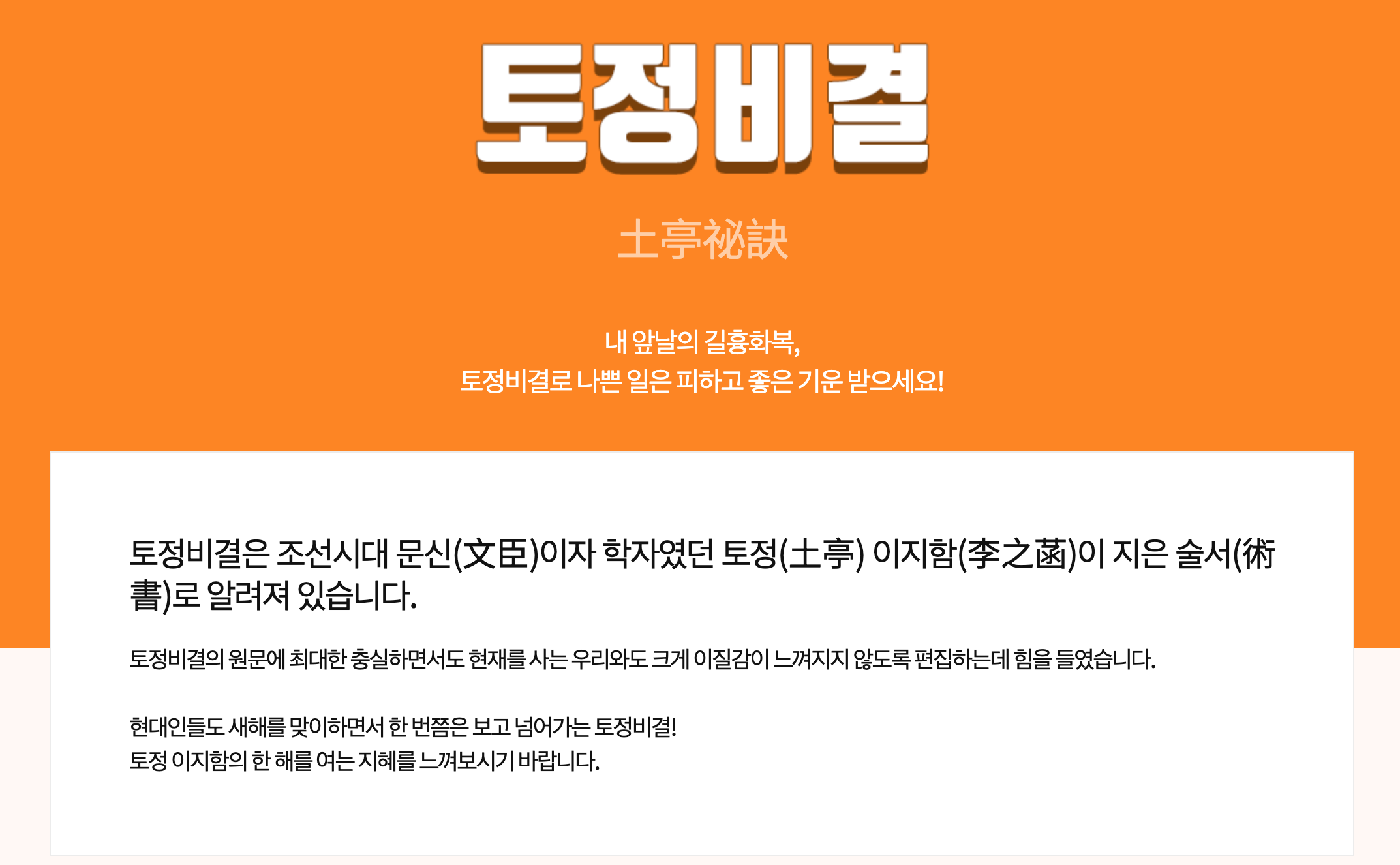 토정비결은 조선시대 문신(文臣)이자 학자였던 토정(土亭) 이지함(李之菡)이 지은 술서(術書)로 알려져 있습니다.토정비결의 원문에 최대한 충실하면서도 현재를 사는 우리와도 크게 이질감이 느껴지지 않도록 편집하는데 힘을 들였습니다.