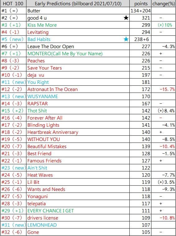 방탄소년단 버터 Butter 빌보드 핫100 6주 연속 1위 예측 Billboard Hot 100 Final Predictions 2021.7.9