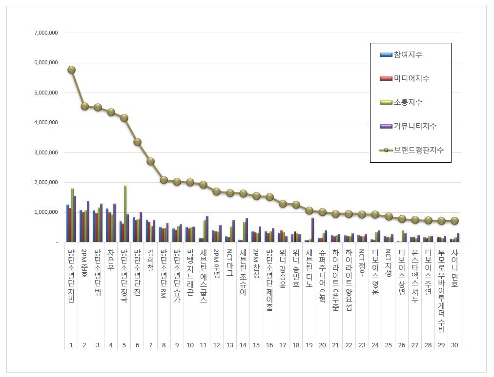 2021년 7월 보이그룹 개인 브랜드평판 30위 순위는 방탄소년단 지민, 2PM 준호, 방탄소년단 뷔, 아스트로 차은우, 방탄소년단 정국, 방탄소년단 진, 슈퍼주니어 김희철, 방탄소년단 RM, 방탄소년단 슈가, 빅뱅 지드래곤, 세븐틴 에스쿱스, 2PM 우영, NCT 마크, 세븐틴 조슈아, 2PM 찬성, 방탄소년단 제이홉, 위너 강승윤, 위너 송민호, 세븐틴 디노, 슈퍼주니어 은혁, 하이라이트 윤두준, 하이라이트 양요섭, NCT 정우, 더보이즈 영훈, NCT 지성, 더보이즈 상연, 몬스타엑스 셔누, 더보이즈 주연, 투모로우바이투게더 수빈, 샤이니 민호, NCT 재민 순으로 분석되었다.