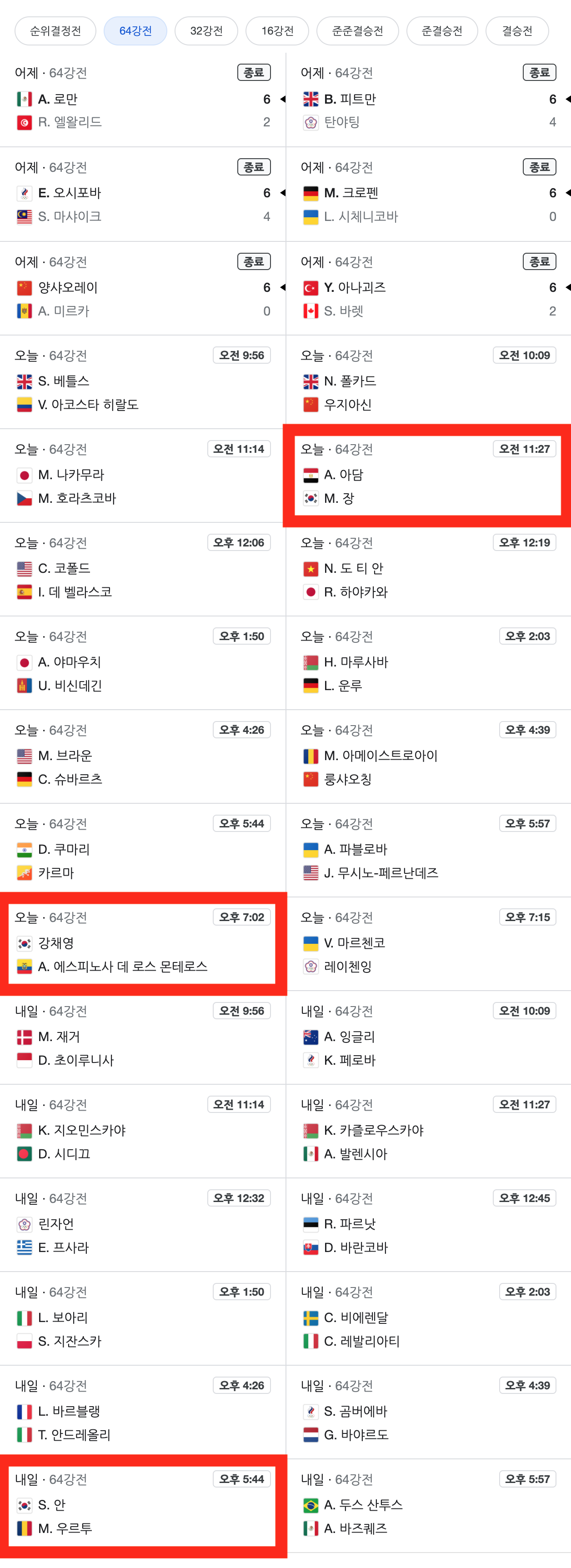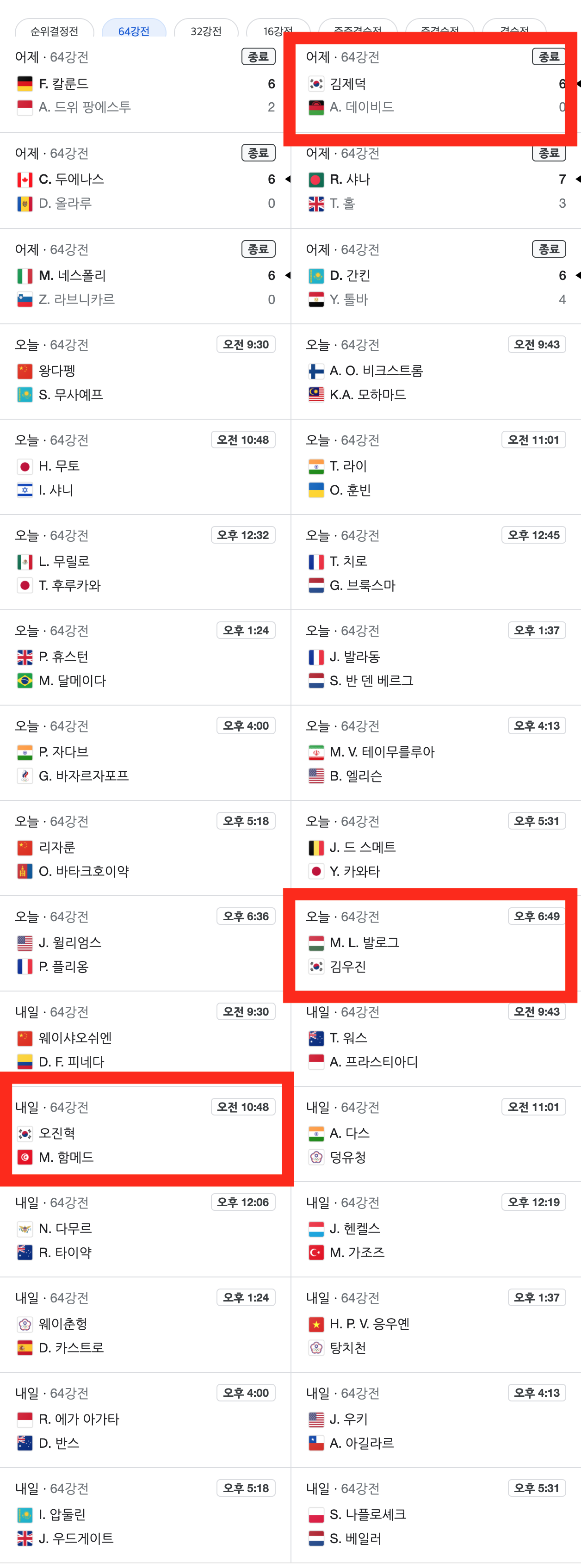 | 도쿄올림픽 남자 양궁 개인전 64강전 대진표 |