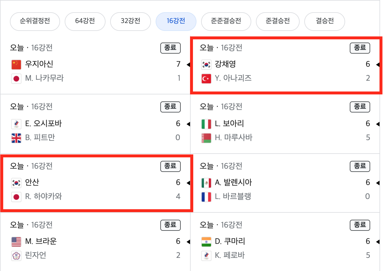 | 도쿄올림픽 여자 양궁 개인전 16강전 대진표 |