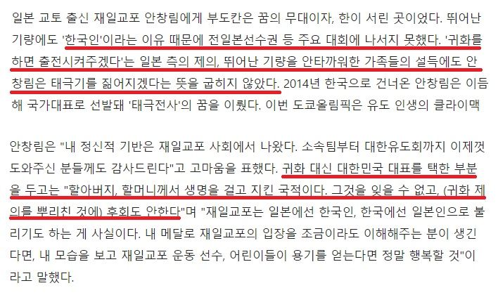 그리고 안창림 선수가 바라듯이 이번에 따낸 동메달로 어쩌면 한일 양국 내에서 소수민족인 재일교포 사회가 용기와 자신감을 얻기를.