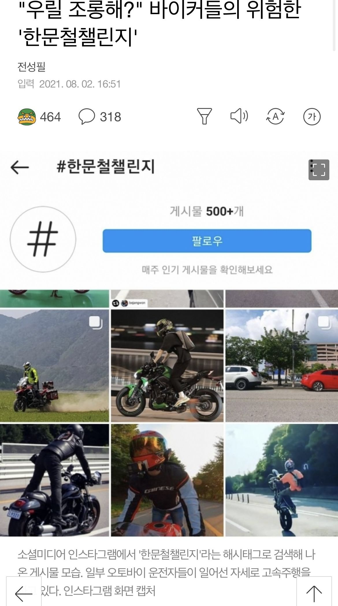 2. 그것을 보고 딸바련(전딸협+바이크 연합)이 ‘한문철챌린지’(오토바이 서서타는 영상을 찍은뒤 한문철 욕하는 인스타 피드를 작성하는 것)라는 것을 함
