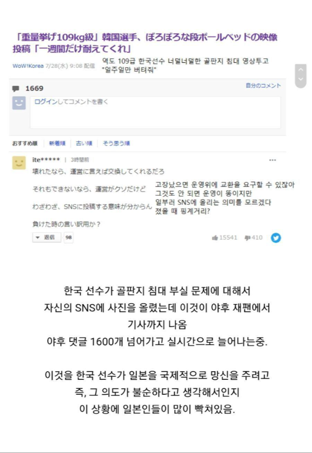 한국 선수가 골판지 침대 부실 문제에 대해서 자신의 SNS에 사진을 올렸는데 이것이 야후 재팬에서 기사까지 나옴