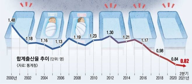 국회예산정책처 분석에 따르면 2006년부터 지난해까지 16년간 저출산 대응을 위해 중앙정부 차원에서만 투입된 예산(국비)이 198조 7000억원에 달한다. 지난해에만 42조 9000억원을 쏟아부었다. 그럼에도 출산율이 반등할 기미를 보이기는커녕 날개 없는 추락만 거듭하고 있다. 예정처는 “정부 정책 중엔 저출산 대책의 목적에 부합하지 않는 사업들이 있다”며 “수혜자 입장에서 정책의 효과성을 고려할 필요가 있다”고 지적했다.