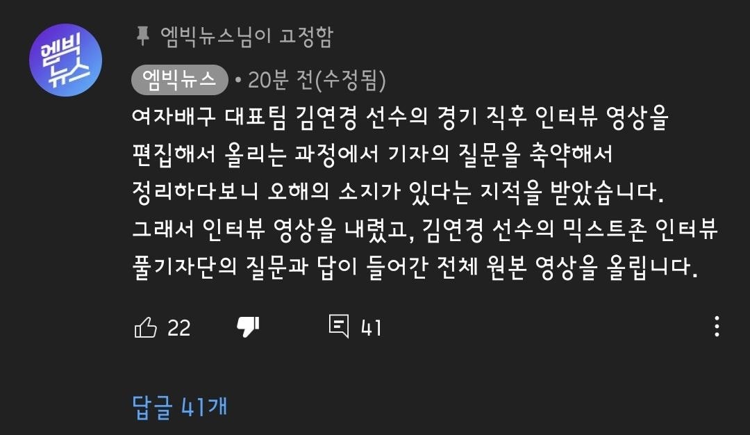 현재는 삭제 되었다는 엠빅뉴스 김연경 선수 인터뷰 자막상태