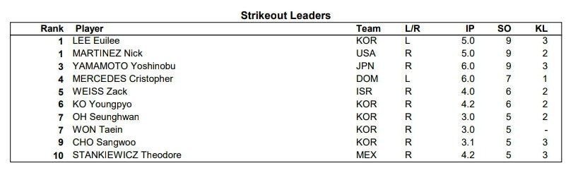 2020 도쿄올림픽 탈삼진 순위입니다.