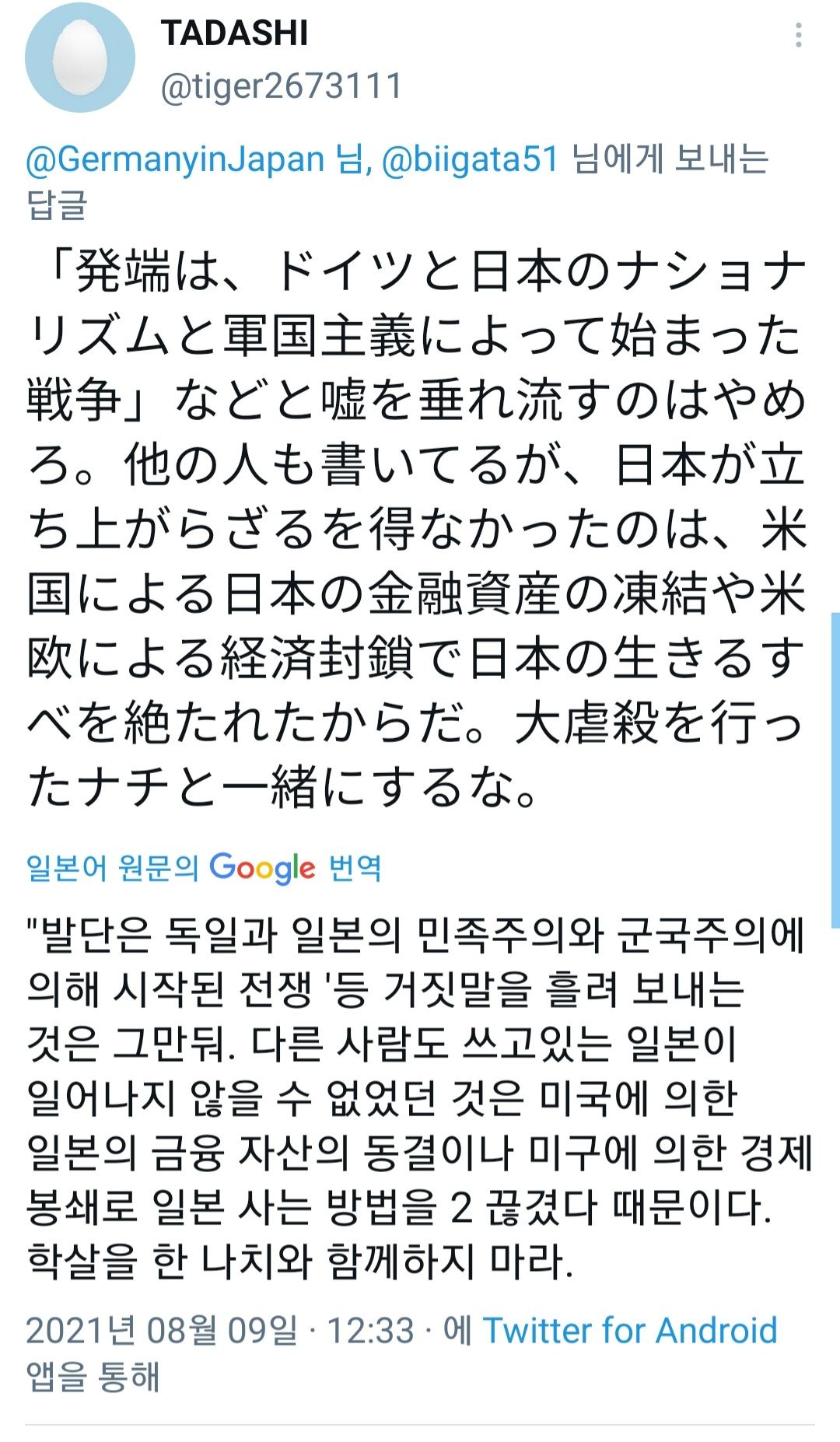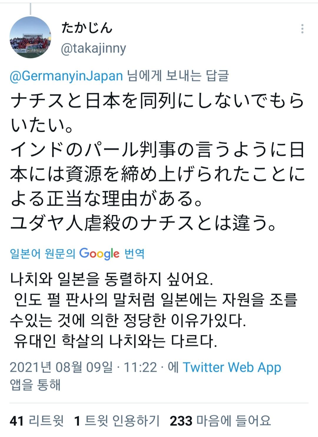 그리고 이 사건의 발단이 독일의 민족주의와 일본의 군국주의에 의해 시작된 전쟁이었다고 추가 트윗 올리면서 환호하던 넷우익들 발작버튼 눌림